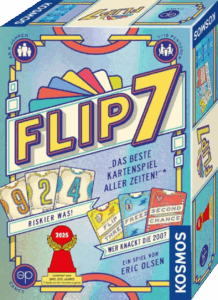 Bei Flip 7 ist Nervenkitzel garantiert! Runde für Runde sammeln die Spielerinnen und Spieler Karten, um ihre Punktzahl in die Höhe zu treiben. Doch Vorsicht – wer eine doppelte Zahlenkarte zieht, fliegt sofort raus! Strategisches Denken und ein Quäntchen Glück sind gefragt, denn nur wer clever mit den Aktions- und Bonuskarten spielt, hat eine Chance auf den begehrten „Flip 7“ und den Sieg.